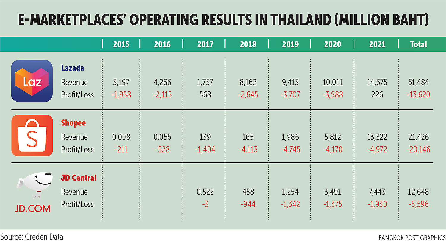 Creden Data的首席执行官Pawoot Pongvitayapanu表示,这三大电商平台为了获取用户一直在烧钱,导致在过去七年中损失了近400亿泰铢。