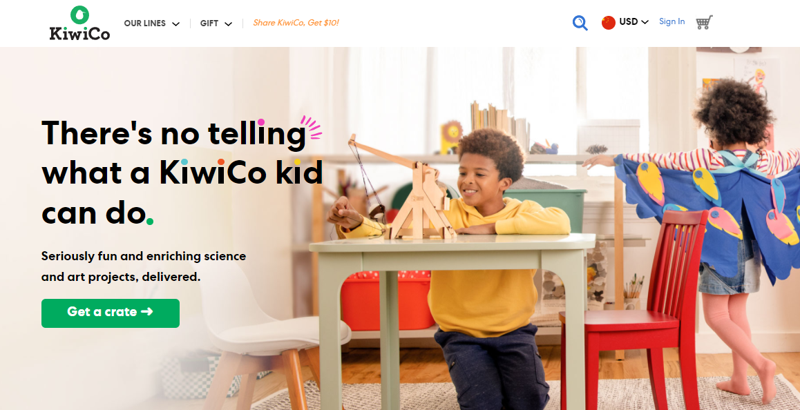 KiwiCo是一家为儿童和青少年提供针对不同年龄段创意需求,培养其动手能力和鉴赏力,激发兴趣和创造力的订阅盒子网站,对孩子来说,每月收到这样一个趣味性十足的盒子,无疑是一件快乐又兴奋的事,而对家长而言,订阅这样一个创意盒子,不仅能激发孩子的创造力、避免孩子在移动设备上花费过多时间,又能减轻自己因工作压力引起的育儿负担,实现双赢,产品除手工艺术品外,还涉及工程、科学、音乐等创造领域,成年人老年人也值得拥有,网站上对产品进行了年龄段划分,从0到104岁的大跨度。