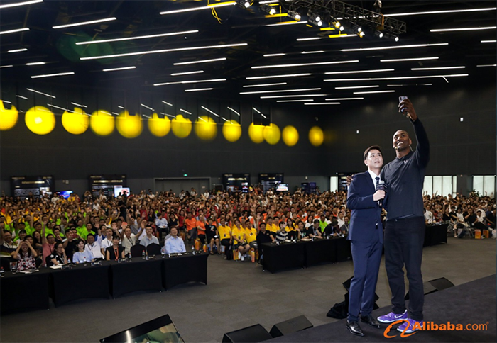 (图说:前NBA球星慈世平在阿里巴巴国际站跨境商家峰会上与全场合影)