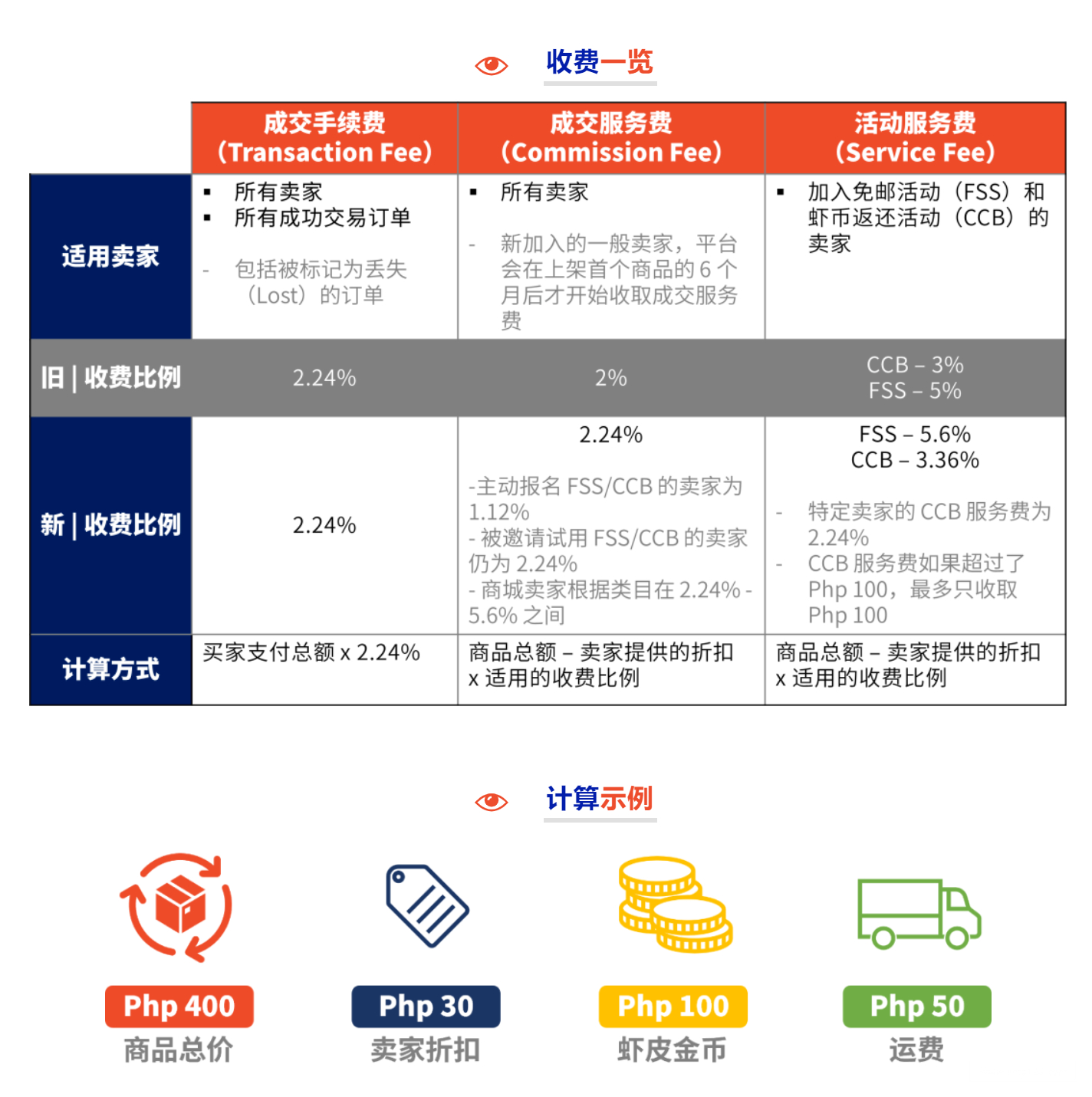 ■ 2022/9/1 起,成交服务费将从 2% 调整至 2.24%;免邮活动服务费(FSS)将从 5% 调整至 5.6%;虾币返还服务费(CCB)将从 3% 调整至 3.36%