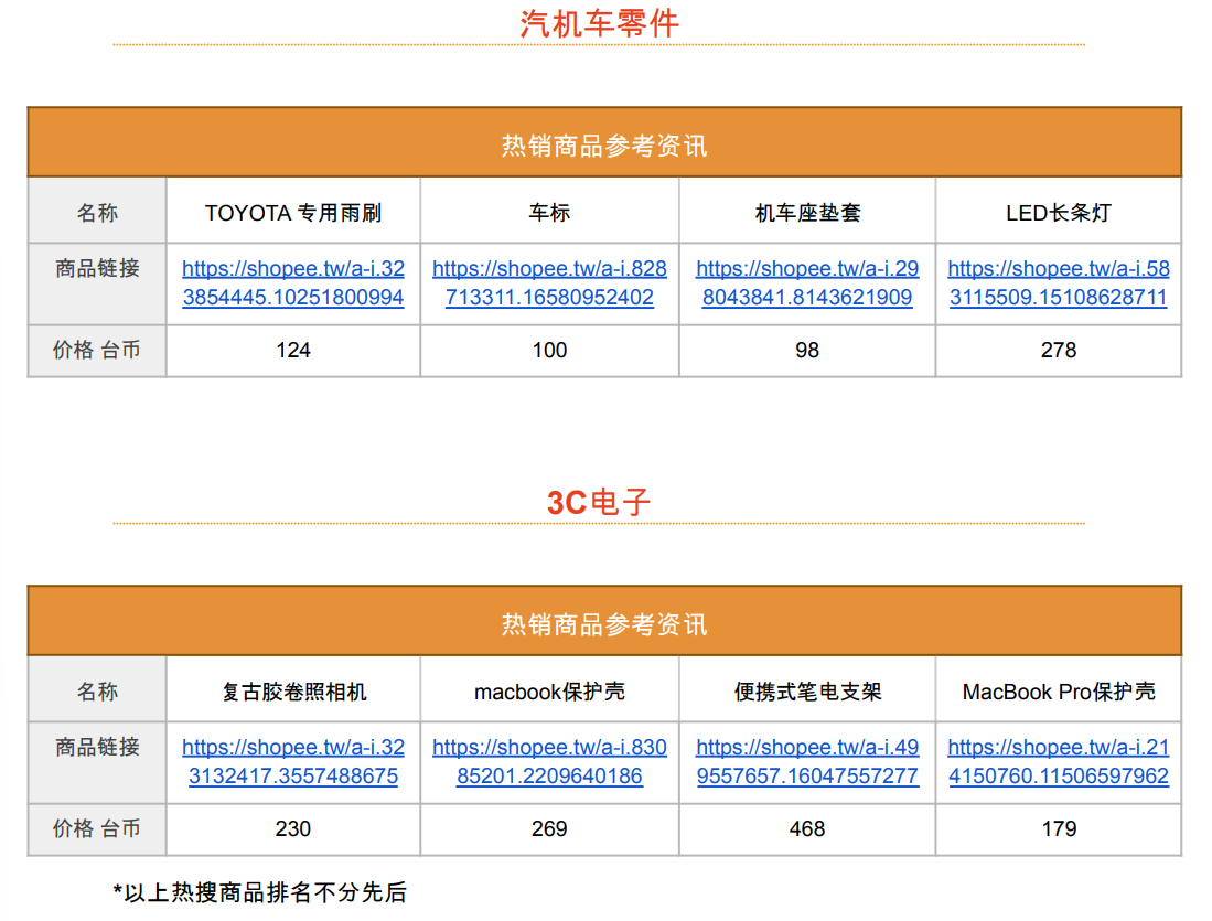 根据最新台湾相关法律法规,以下商品将禁止出售:苹果/安卓手机空机,其他厂牌手机,平板电脑, 行动电源,自拍神器,含蓝牙产品 ,儿童座椅,汽车安全座椅,保险套,手推车,除蚤用品,冷气/电 视遥控器,收音机,电视盒,路由器,无线键盘/鼠标/耳机/喇叭/麦克风,笔记本电脑,智能穿戴设备, 动植物及农产品商品,保健食品,体脂体重秤,香水。