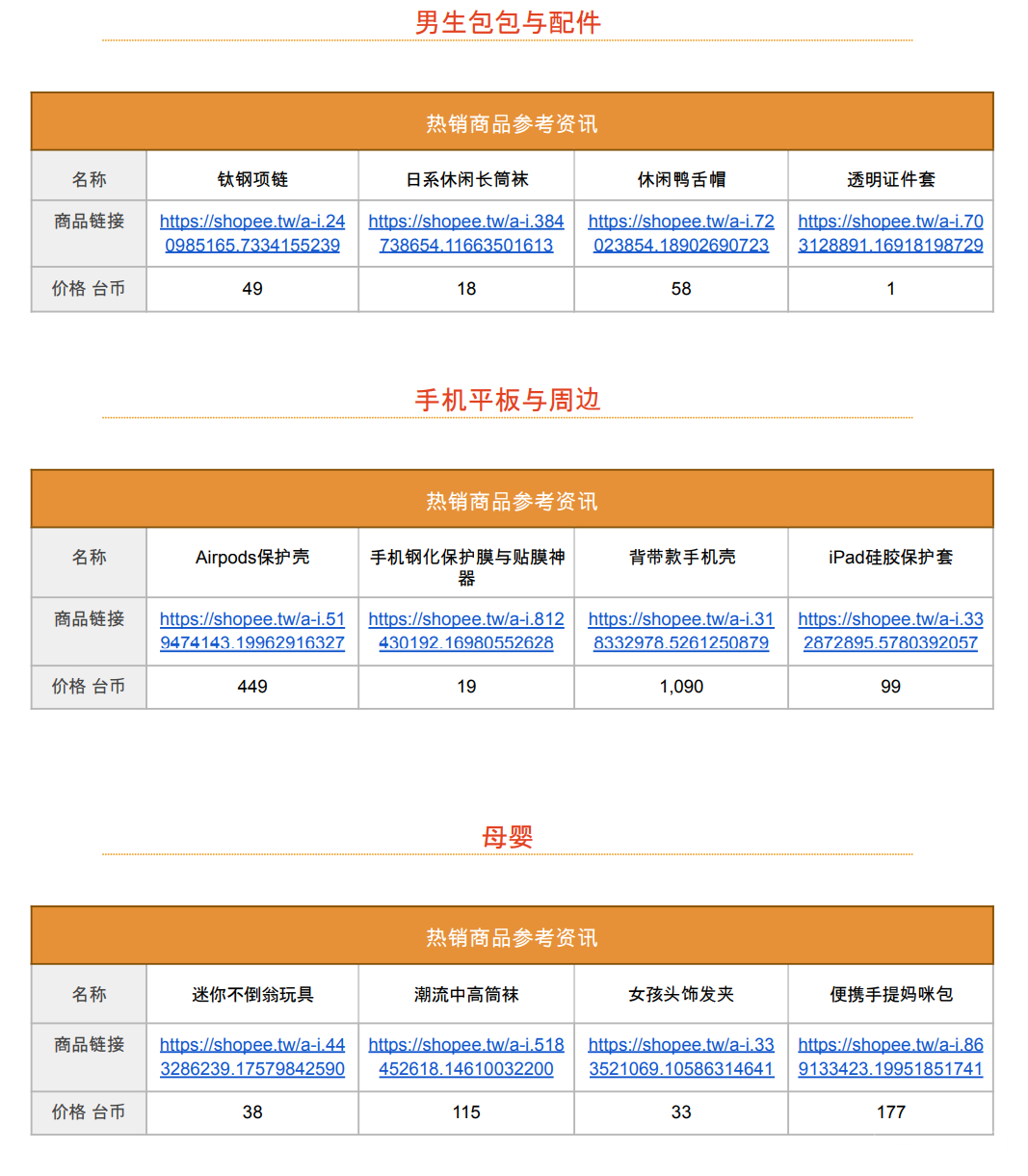 根据最新台湾相关法律法规,以下商品将禁止出售:苹果/安卓手机空机,其他厂牌手机,平板电脑, 行动电源,自拍神器,含蓝牙产品 ,儿童座椅,汽车安全座椅,保险套,手推车,除蚤用品,冷气/电 视遥控器,收音机,电视盒,路由器,无线键盘/鼠标/耳机/喇叭/麦克风,笔记本电脑,智能穿戴设备, 动植物及农产品商品,保健食品,体脂体重秤,香水。