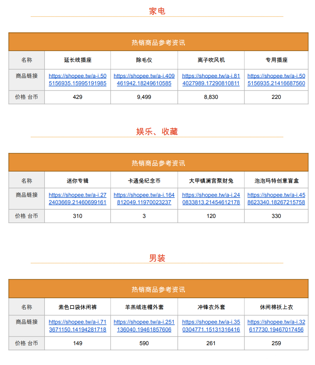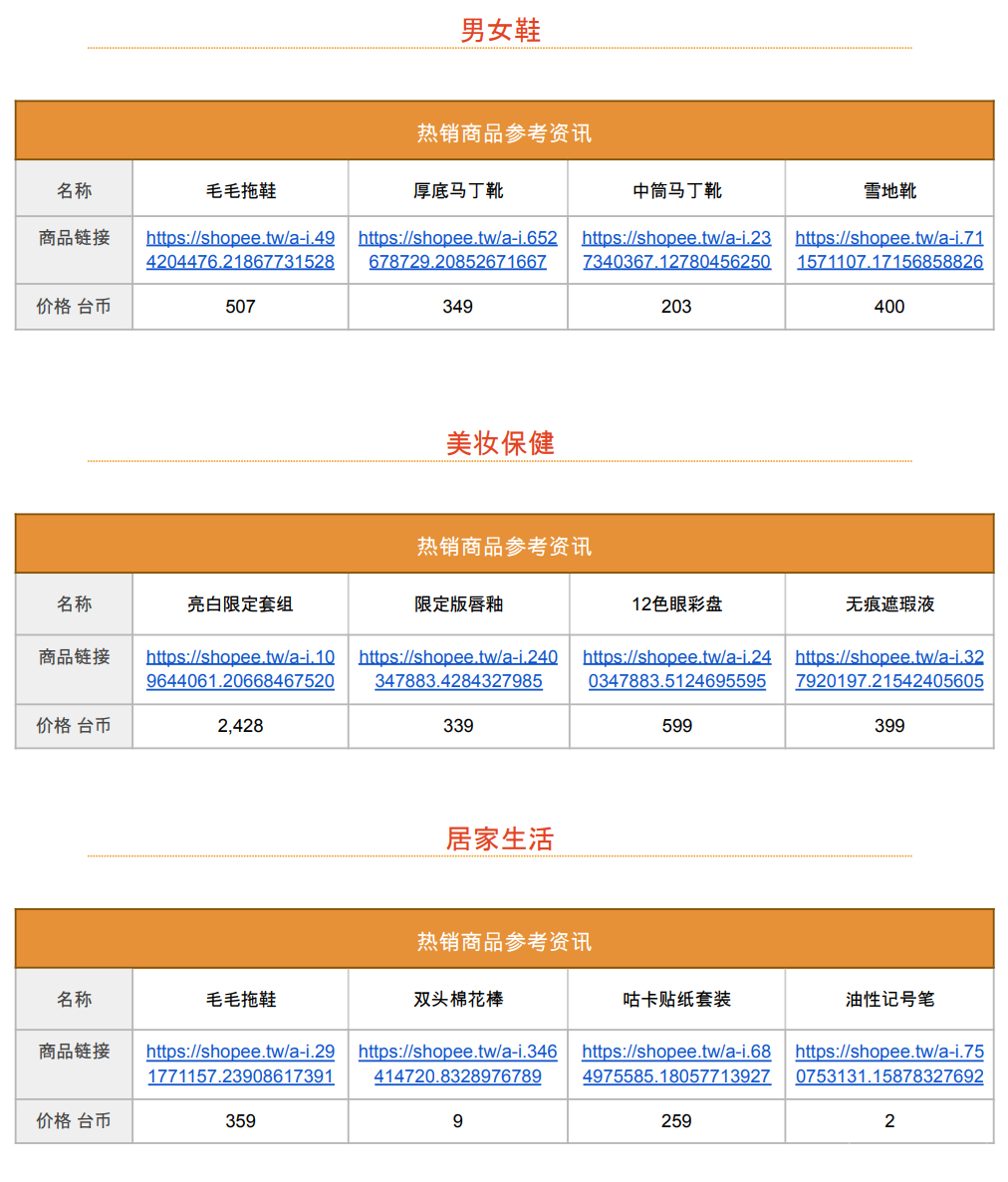 ● 趋势分享:随着寒冬到来,部分商家已陆续推出跨年主题的LED灯、派对装饰等等。此外,也陆续有卖家上架农历新年的吊饰、红包袋商品,并且数样商品已有几十笔下单量,鼓励卖家开始准备相关商品。新年打扫的时节,也可鼓励卖家多上架平台较热卖的大扫除以及洗车相关商品。