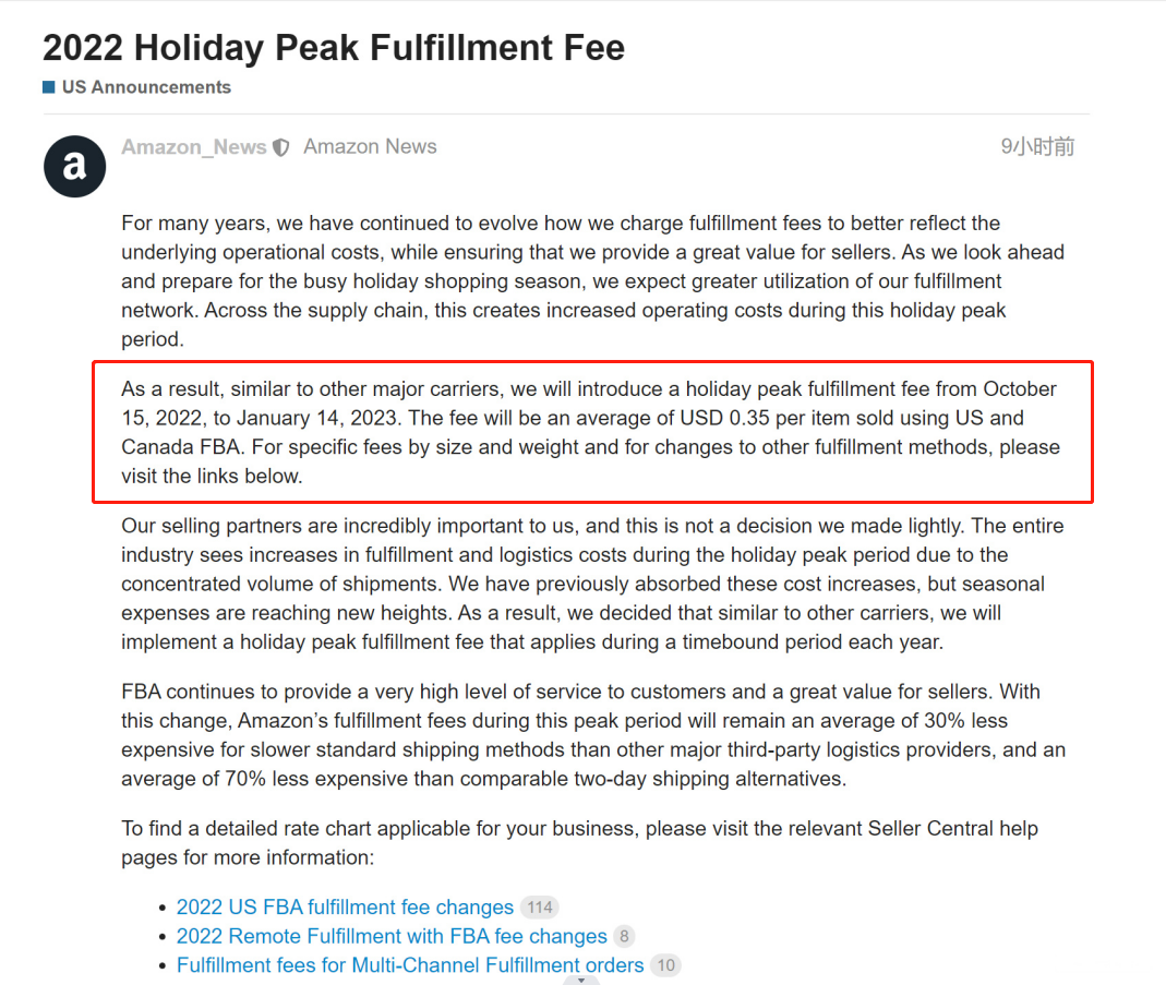 亚马逊表示,由于运营等成本支出达到了新的高度,导致公司更难消化与购物旺季相关的其他成本,因此决定“与其他承运公司一样,将在每年特定的时间段收取假日销售旺季配送费”。